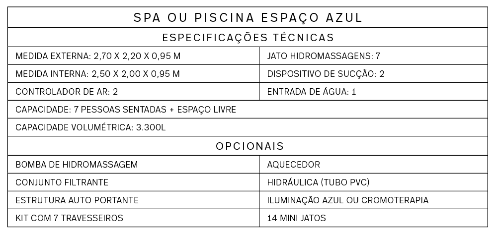 Relaxamento e bem-estar com design sofisticado e funcional. Acomoda até 7 pessoas sentadas, além de oferecer espaço livre, proporcionando um ambiente espaçoso e convidativo. Com 7 jatos de hidromassagem oferecem uma massagem revigorante. Com capacidade para 3.300 litros de água, o SPA/PISCINA ESPAÇO AZUL é o refúgio perfeito para recarregar as energias e desfrutar de momentos de lazer.