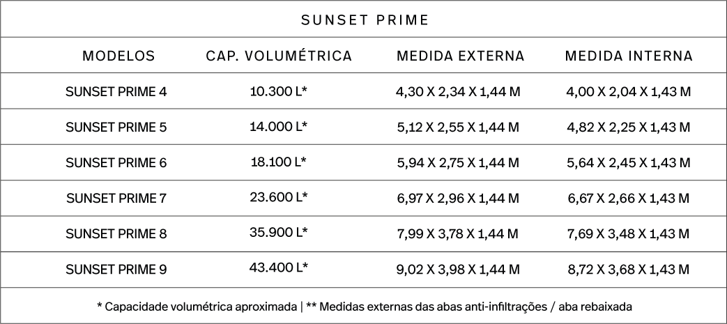 * Capacidade volumétrica aproximada | ** Medidas externas das abas anti-infiltrações / aba rebaixada